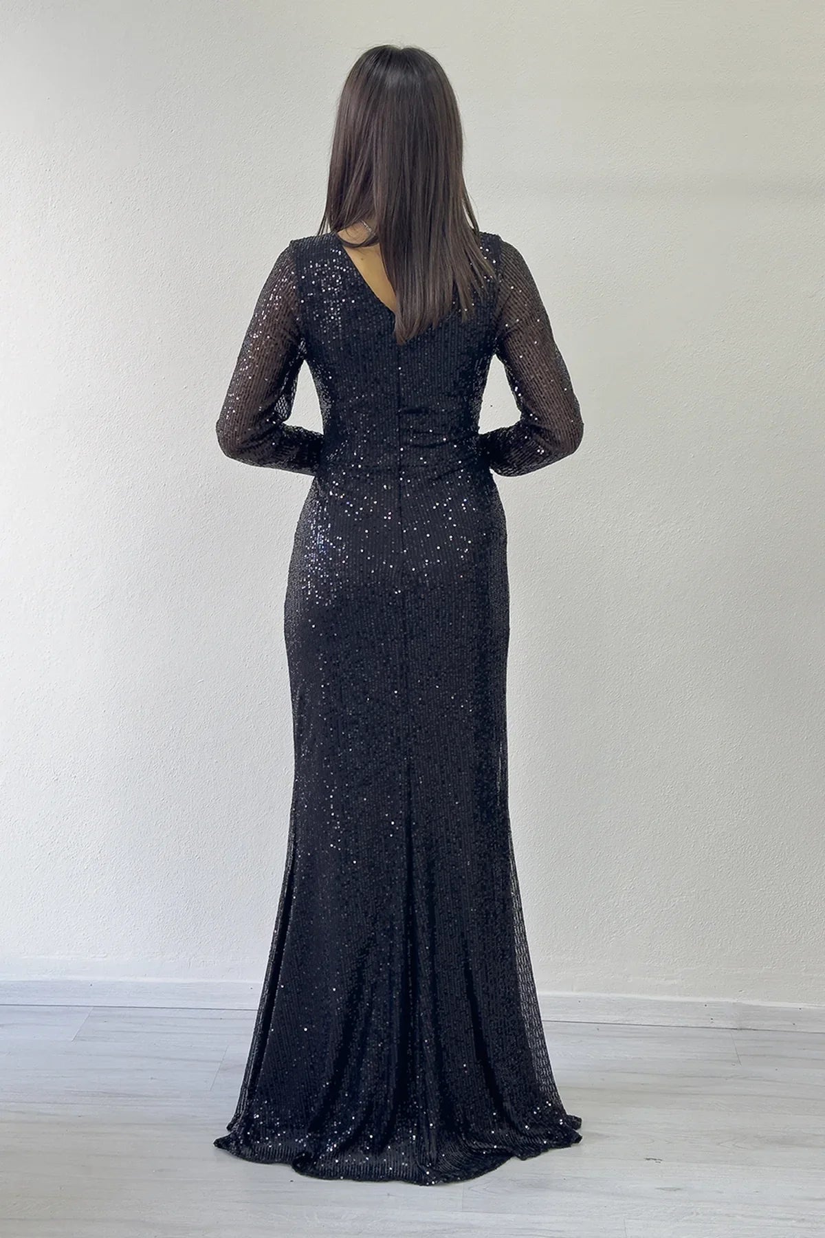 فستان سهرة طويل أسود مزين بالترتر