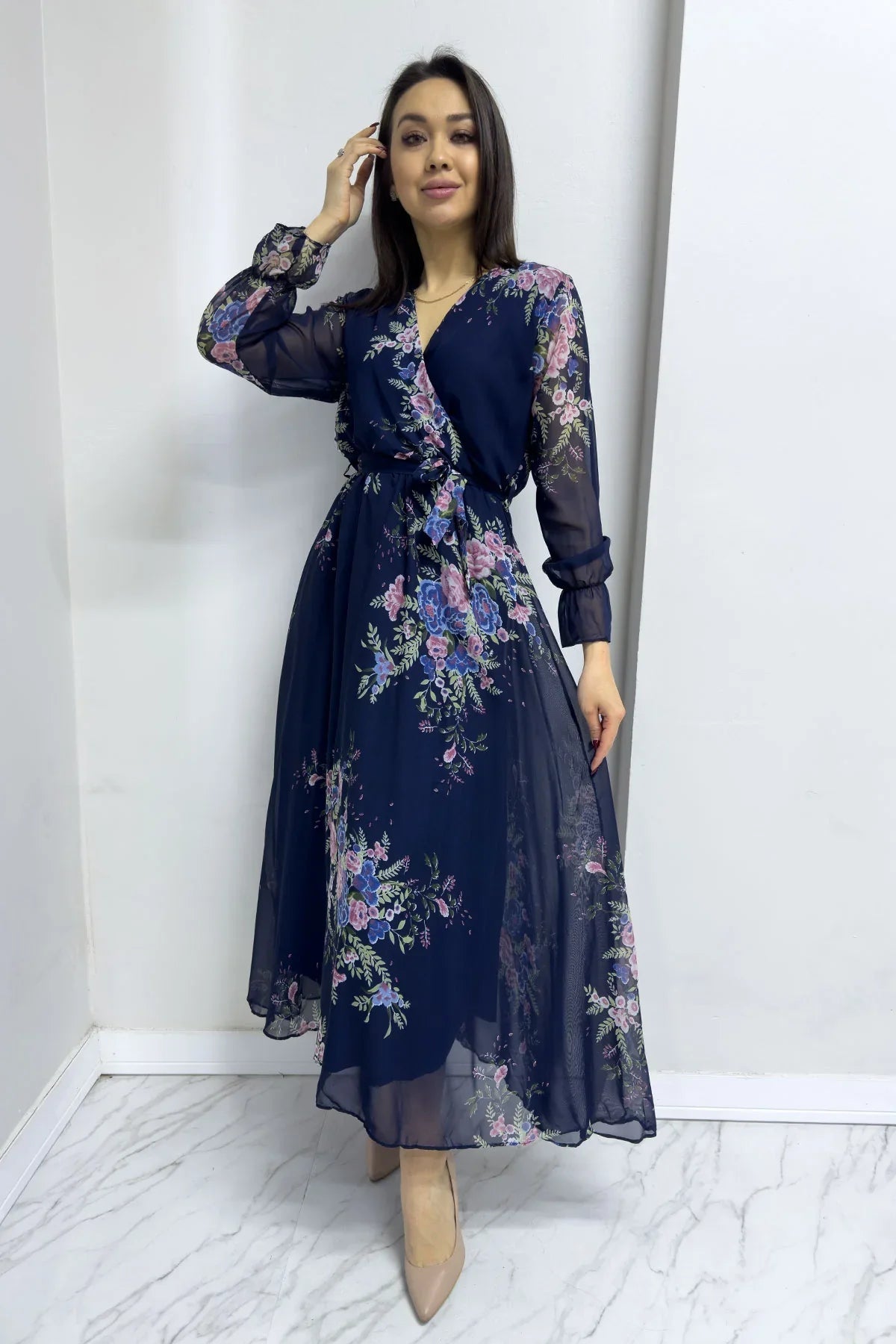 فستان ميدي شيفون أزرق داكن مزين بالزهور