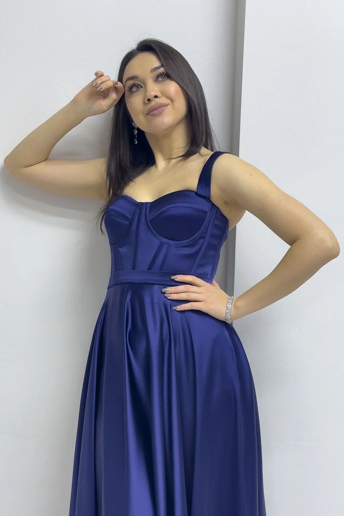 فستان سهرة متوسط الطول من الساتان باللون الأزرق الداكن