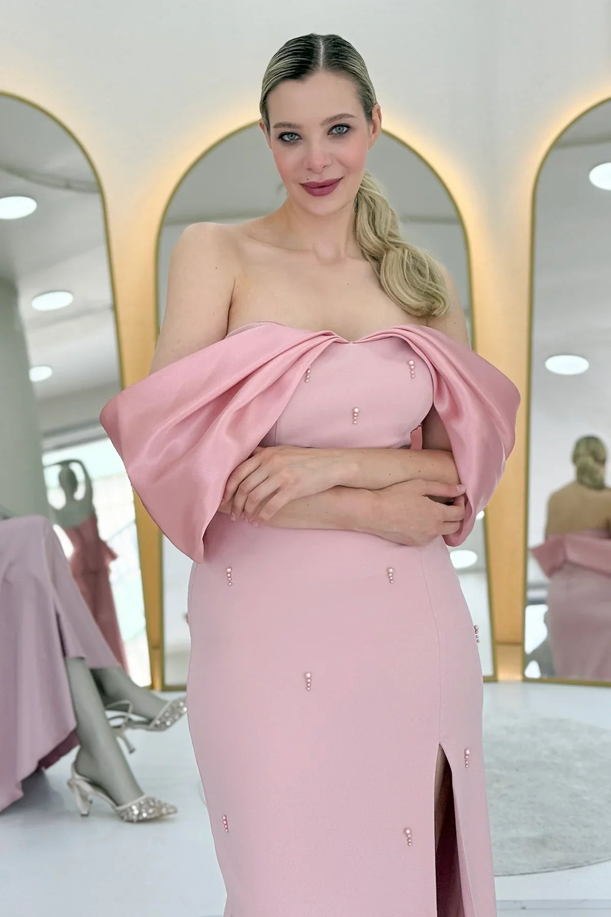 فستان سهرة ماكسي من الساتان بلون وردي فاتح مكشوف الكتفين
