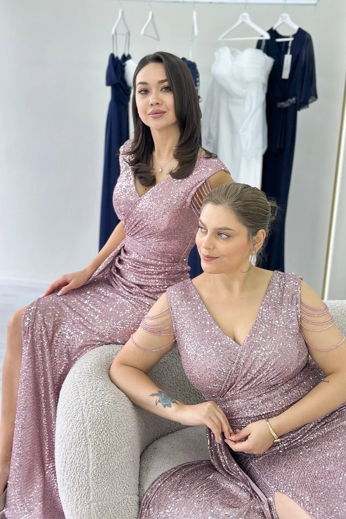 فستان سهرة ماكسي مزين بالترتر باللون الوردي الفاتح
