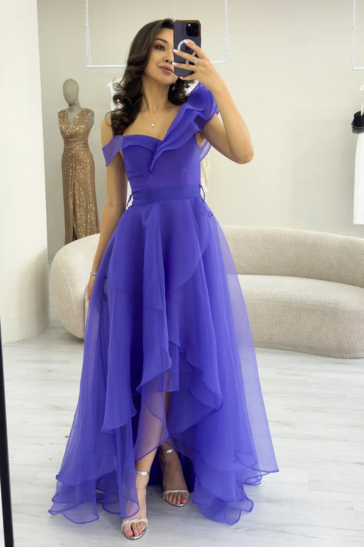 فستان سهرة من التول الأرجواني بتنورة غير متماثلة