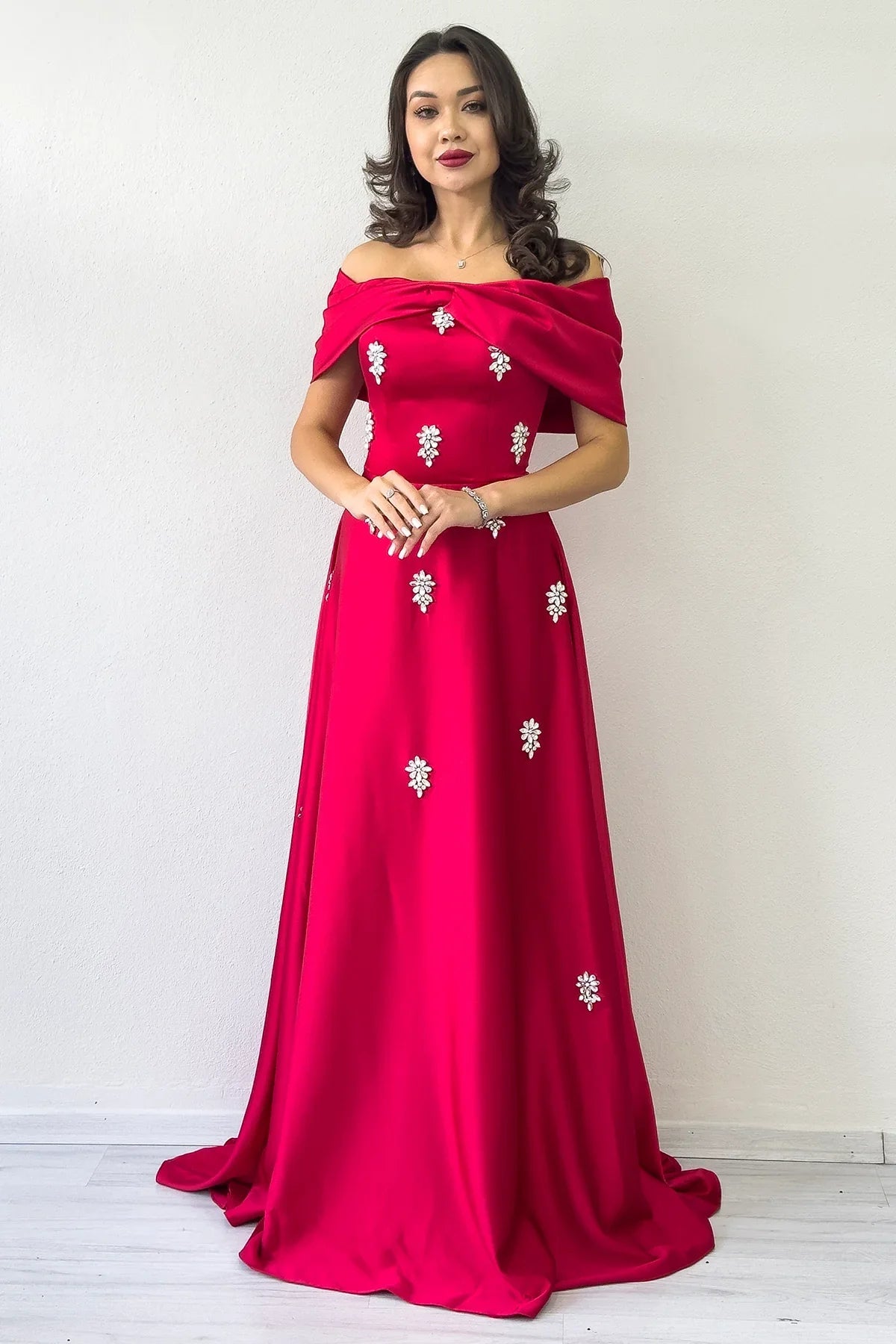 فستان سهرة من الساتان مزين بأحجار وياقة على شكل فيونكة حمراء