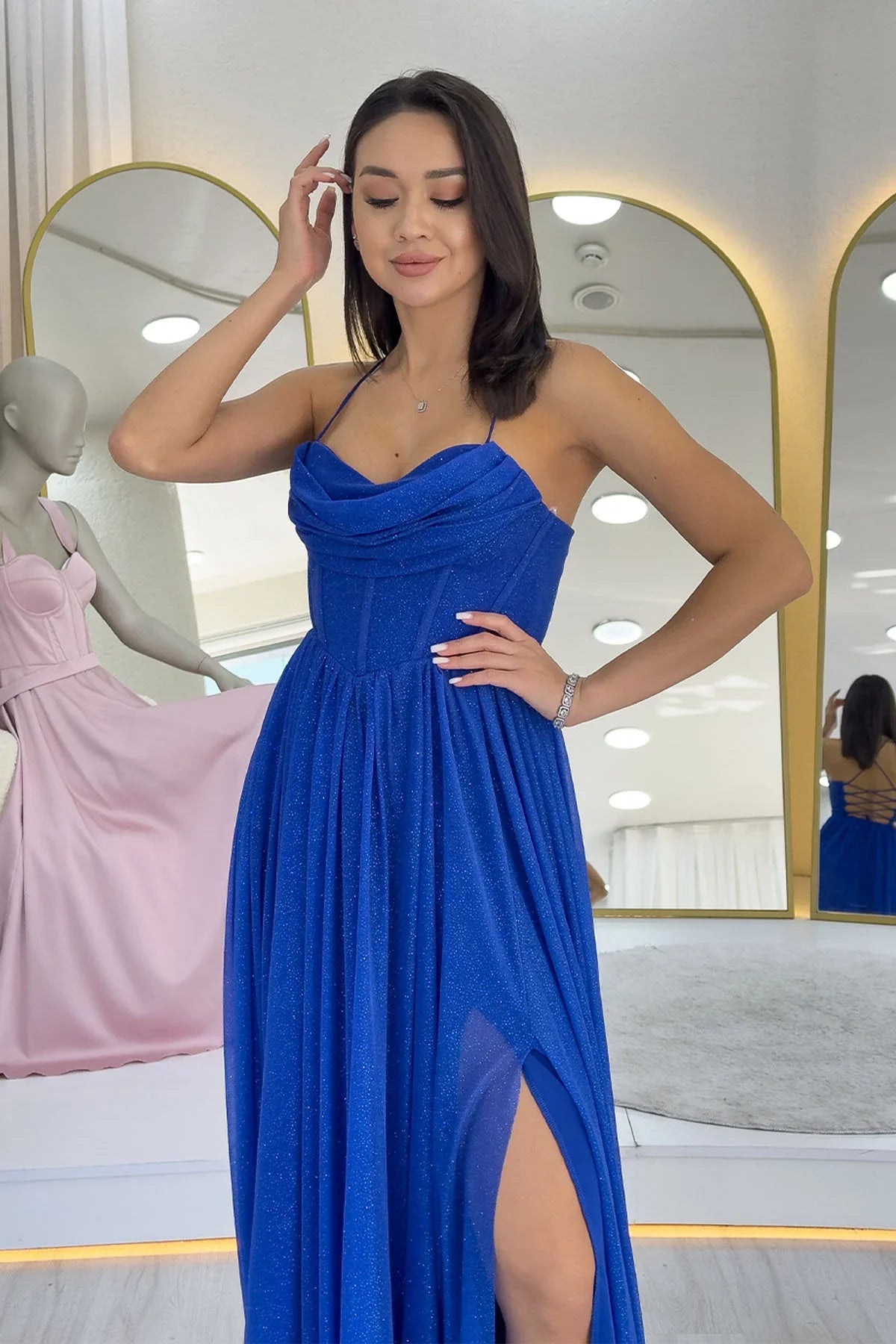 فستان سهرة أزرق من ساكس، مزين بالترتر، مكشوف الظهر، بفتحة جانبية وتفاصيل كورسيه، بتصميمه الفريد الذي يجمع بين الأناقة والعصرية، يضمن لكِ أن تكوني نجمة الأمسية. يلفت قماش الترتر اللامع الأنظار ببريقٍ أخّاذ مع كل خطوة، بينما تضفي فتحة الظهر العميقة لمسة أنثوية رقيقة. أما تفاصيل الكورسيه، التي تُحيط بالجسم بانسيابية، فتُبرز قوامكِ وتُضفي عليكِ إطلالة ساحرة. كما تُتيح الفتحة الجانبية حرية الحركة وتُضفي لمسة جريئة على الفستان. هذا الفستان المسائي، مثالي لحفلات الزفاف والخطوبة والتخرج والمناسبات الخاصة، يمنحكِ إطلالة لا تُنسى بفضل لونه الجريء وتفاصيله البراقة. يجمع هذا التصميم بين أناقة اللون الأزرق الياقوتي وقماش مُرصّع بالترتر، ليصبح الخيار الأمثل للمرأة الواثقة من نفسها. متوفر بمقاسات كبيرة تناسب جميع أشكال الجسم، ومن المؤكد أن هذا الفستان سيصبح قطعة مميزة في خزانتكِ.