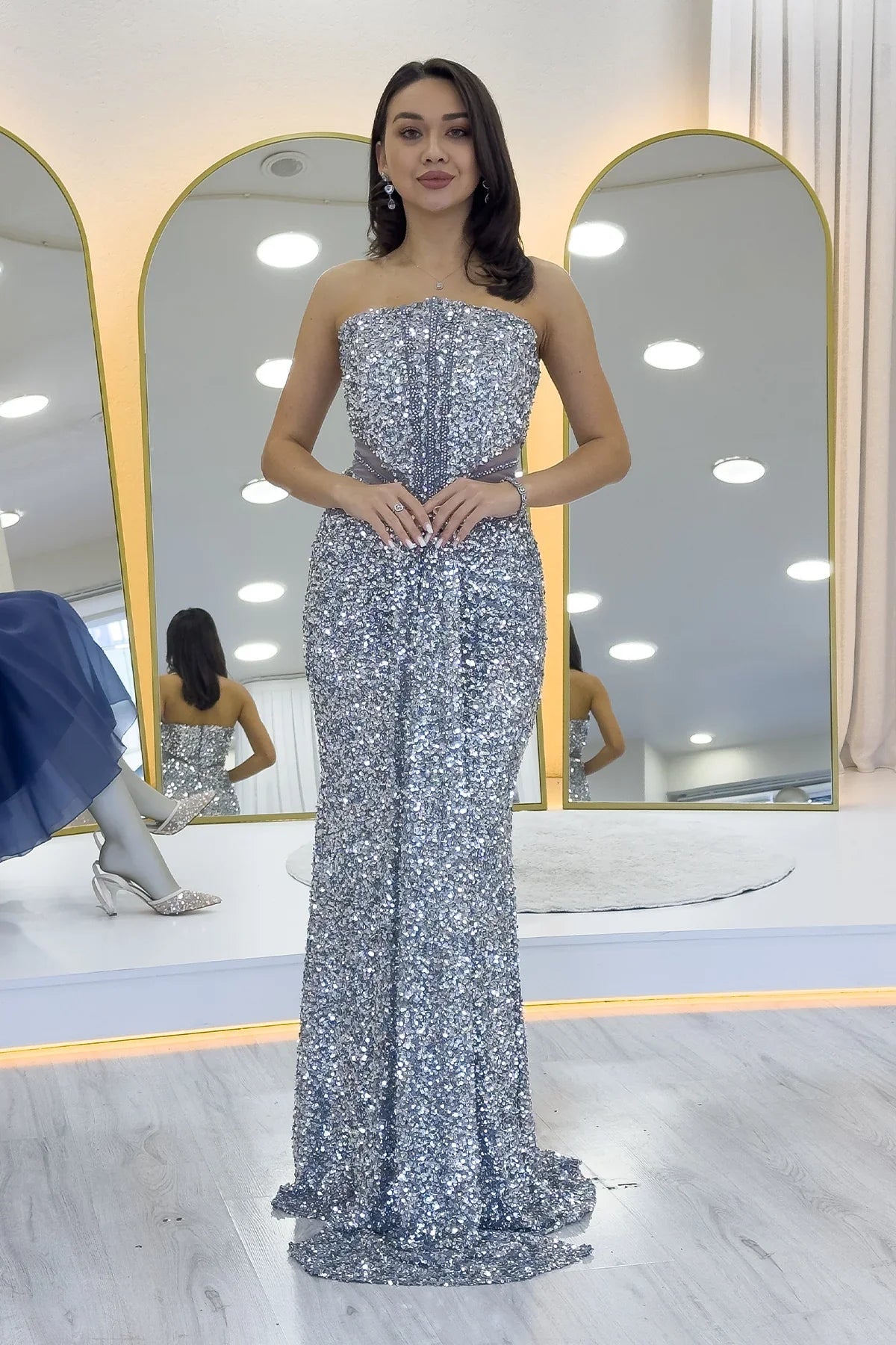 فستان سهرة فضي بدون حمالات مزين بالترتر