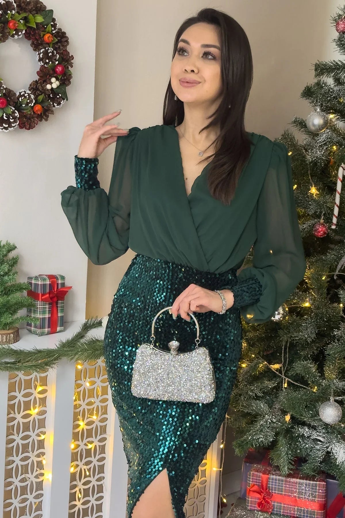 Emerald Green Midi Length Sequin Evening Dress