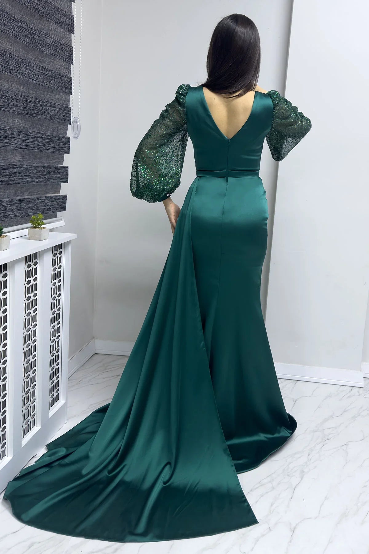 Crossover Neckline Emerald Green Drape with Sequined Sleeves Satin Evening Dress Inspired by nature's elegance in emerald green and designed with the sparkle of sequined details, the Crossover Neckline Emerald Green Drape with Sequined Sleeves Satin Evening Dress ensures you stand out with your elegance on special occasions. The cross-over neckline offers a feminine silhouette, while the draped details and the flowing texture of the satin fabric add a luxurious feel to the dress. The sequined sleeve design provides a sophisticated and modern touch. Colour and Fabric Emerald Green Colour: A sophisticated and eye-catching tone inspired by nature. Satin Fabric: Adds elegance to the dress with its smooth and shiny texture. Sequin Sleeve Details: Offers sparkling elegance and a modern feel. Design Details Crew Neck: Elegantly accentuates the neck and shoulder line, adding a feminine touch. Drape Details: Adds volume and graceful movement to the dress. Sequined Long Sleeves: Offers eye-catching elegance and a sophisticated look. Maxi Length: Ideal length for special occasions and events. Fabric and Comfort The satin fabric, with its soft texture, provides both comfort and style. The sequined details offer a dazzling sparkle under the light. The draped design adapts to the body, offering both aesthetic appeal and comfort. Occasions Weddings and Engagement Ceremonies: Create a flawless combination with elegant stilettos and simple jewellery. Formal Invitations: Complete the look with a shiny clutch and minimal accessories to create a sophisticated vibe. Romantic Dinners: Achieve a feminine style with high heels and an elegant shawl. Photo Shoots: Capture stunning shots with the elegance of emerald green and the luxurious feel of glittery details. Benefits The emerald green tone offers a regal and elegant look. The crossover neckline design adds a modern and feminine touch. The sequined sleeve details give the dress a striking sparkle and sophisticated feel. The satin fabric offers a luxurious and chic option for special occasions. This elegant and luxurious dress stands out in searches for emerald green satin evening gowns, cross-neck sequined sleeve dresses, or chic dresses for special occasions. Visit The ZKS now and make your style unforgettable with this unique design! 💚✨👗