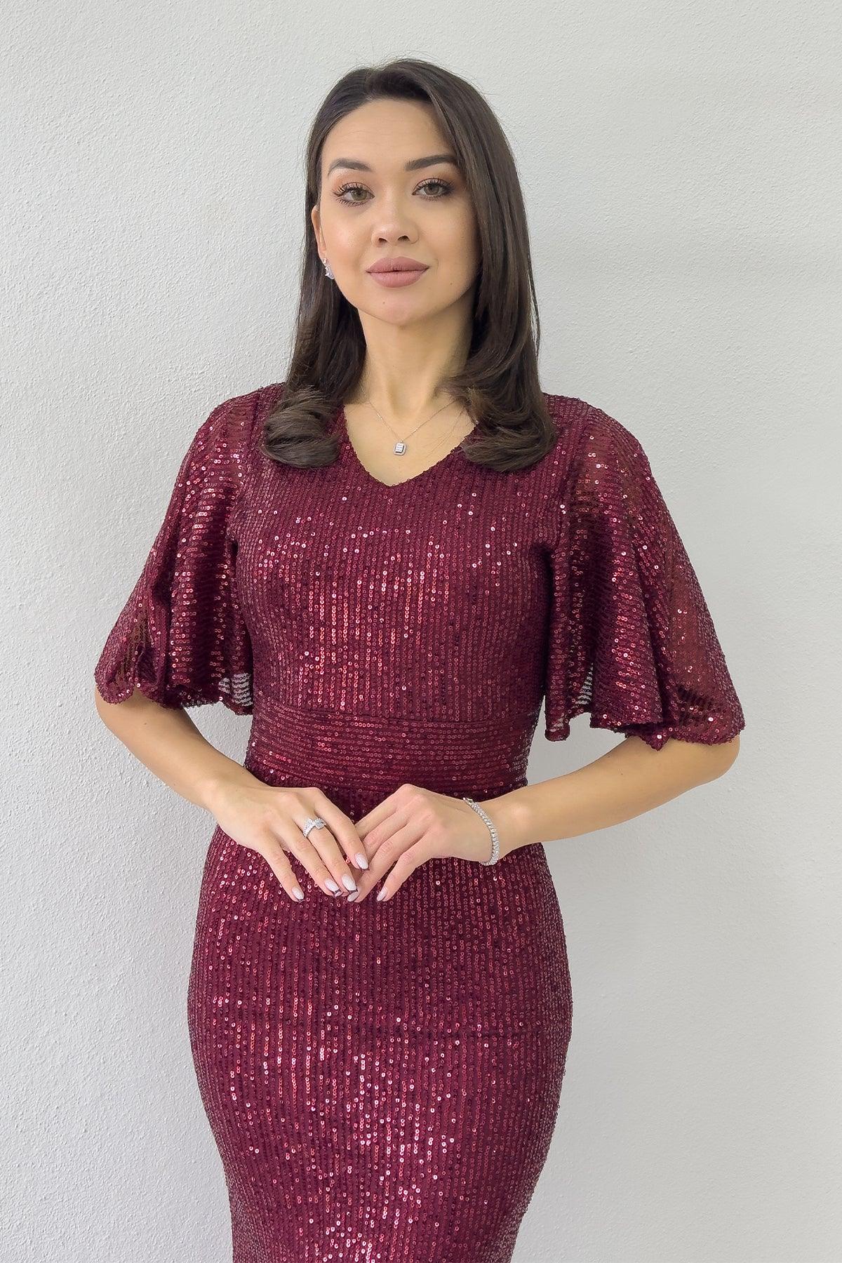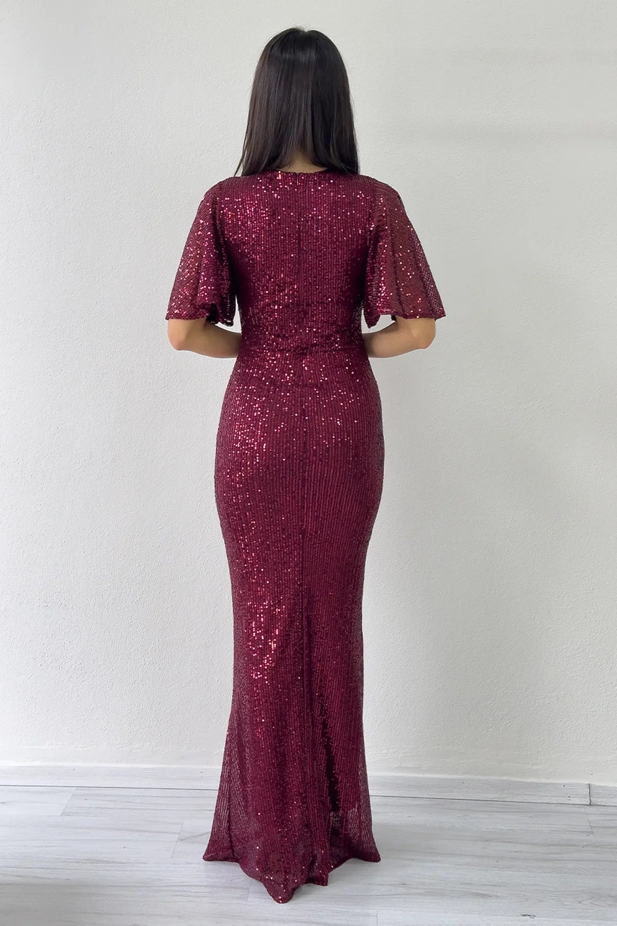 Women's Burgundy Ruffle Sleeve Sequined Fishtail Evening Dress, designed for women who want to be the star of the night with its elegance and dazzling sparkle. The fishtail shape, which perfectly hugs the body, combines with elegant ruffle sleeves to create a feminine silhouette. The nobility of the burgundy colour, combined with the sparkle of the sequins, creates a look that is both classic and modern. It is the perfect choice for evening events, engagements, weddings, special celebrations and red carpet appearances. Thanks to the high-quality sequin fabric, the dress has a flexible yet form-fitting structure. The fabric texture reflects light differently with every movement, making you stand out. Its lined inner structure ensures comfortable wear without showing through. The fishtail skirt creates an elegant flow when walking and makes the legs appear longer than they are. The ruffle details on the shoulder and arm areas give the dress a romantic feel, setting it apart from classic sequined dresses. The hidden zip detail on the back makes it easy to put on and take off. The burgundy tone of the dress creates a warm and regal effect while highlighting the skin tone. You can complete your look with a pair of thin-heeled shoes and an elegant clutch bag. Reflecting the feminine and powerful lines of ZKS, this design will become one of the special pieces in your wardrobe with its bold stance and detailed craftsmanship. With its sequined surface that sparkles under the light in the photographs, you can achieve an elegant look with simple jewellery or capture a bolder style with glittering accessories. For women who want to stand out at events and attend a special evening with confidence, the Women's Burgundy Ruffled Sleeve Sequined Fishtail Evening Dress is one of the season's most coveted options. Its cut elegantly highlights the body's contours, emphasising confidence in every size. With a wide range of sizes from XS to 3XL, it allows every woman to reflect her radiance.