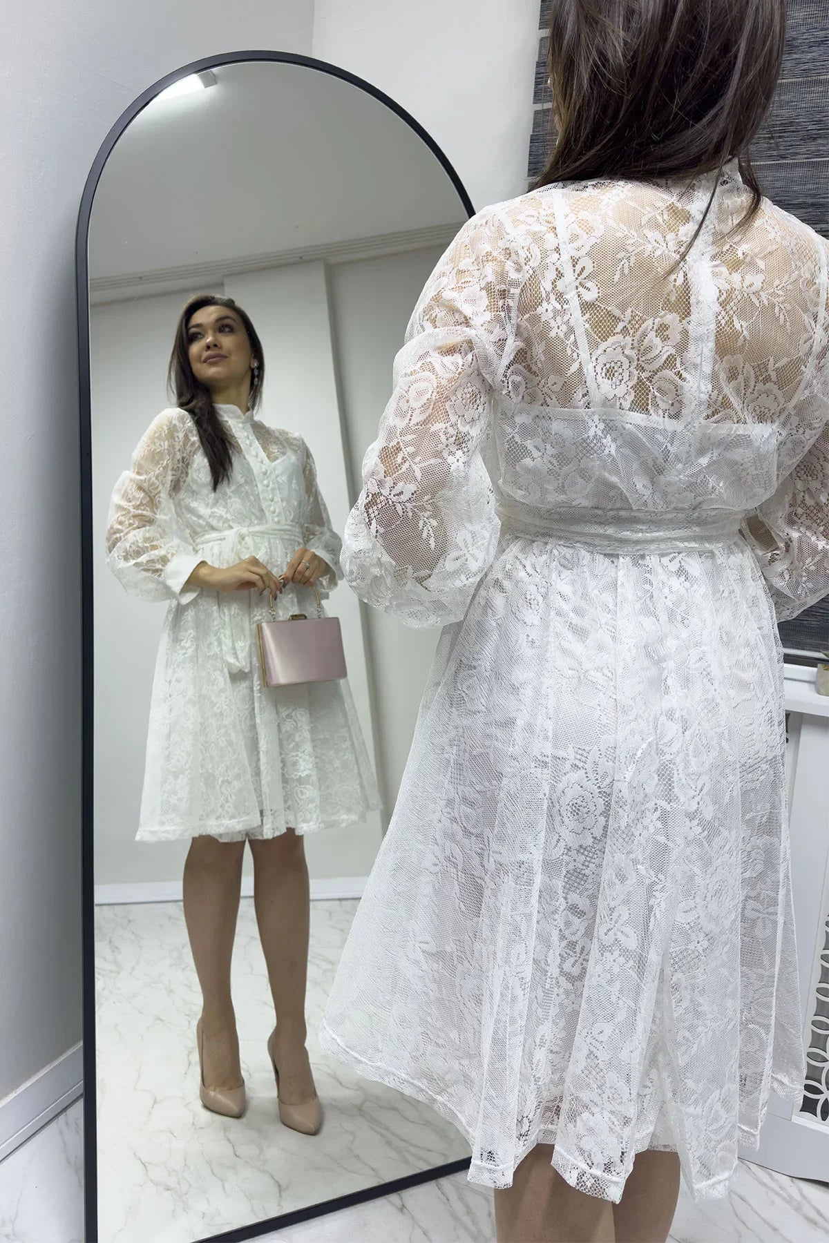 White Bell French Lace Buttoned Plus Size Evening Dress With its elegant and stylish design, the White Bell French Lace Buttoned Plus Size Evening Dress is an excellent choice to highlight your elegance at special events and celebrations. The pure and elegant tones of white, the sophisticated details of French lace, and the bell cut come together to create an elegant look. Colour and Fit: White is a colour that symbolises purity and elegance, drawing attention to you in any setting. French lace details add a romantic touch to the dress and emphasise your elegance. Design Details: French Lace Detail: French lace adds an elegant and sophisticated touch to the dress, standing out with its fine craftsmanship. The lace details enhance the dress's elegance. Bell Cut: The bell cut gracefully hugs your body contours and allows freedom of movement. This cut gives the dress a modern look while offering comfort. Button Detail: The buttons on the front of the dress add an elegant touch and complete the classic chic look. Plus Size Cut: Designed with a wide range of sizes, this evening dress offers both comfort and elegance. It adapts to your body type and fits you perfectly. Short Sleeves and Round Neckline: The short sleeves and round neckline design offer a simple yet elegant look. The dress is comfortable and stylish to wear. Occasions: It is an excellent choice for weddings, engagements, evening parties, graduation ceremonies and special celebrations. The elegance of white complements every special moment. Benefits: French lace and button details can be easily combined with minimal accessories. It offers both a stylish and comfortable look, making you stand out on special days. Plus Size Options: It can be worn comfortably with a wide range of sizes to suit every body type. The White Bell French Lace Buttoned Plus Size Evening Dress emphasises your elegance on special occasions with its elegant and feminine design. Visit ZKS and take your style to the next level with this elegant dress!