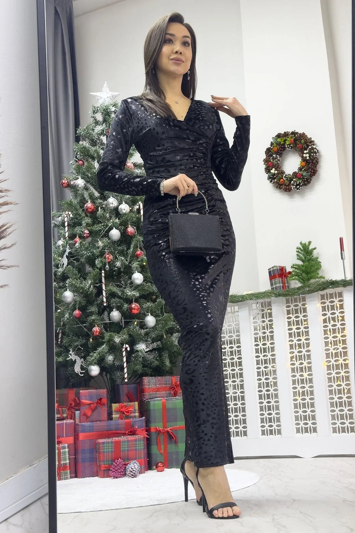 Schwarzes, drapiertes Samt-Midikleid im Bleistiftstil