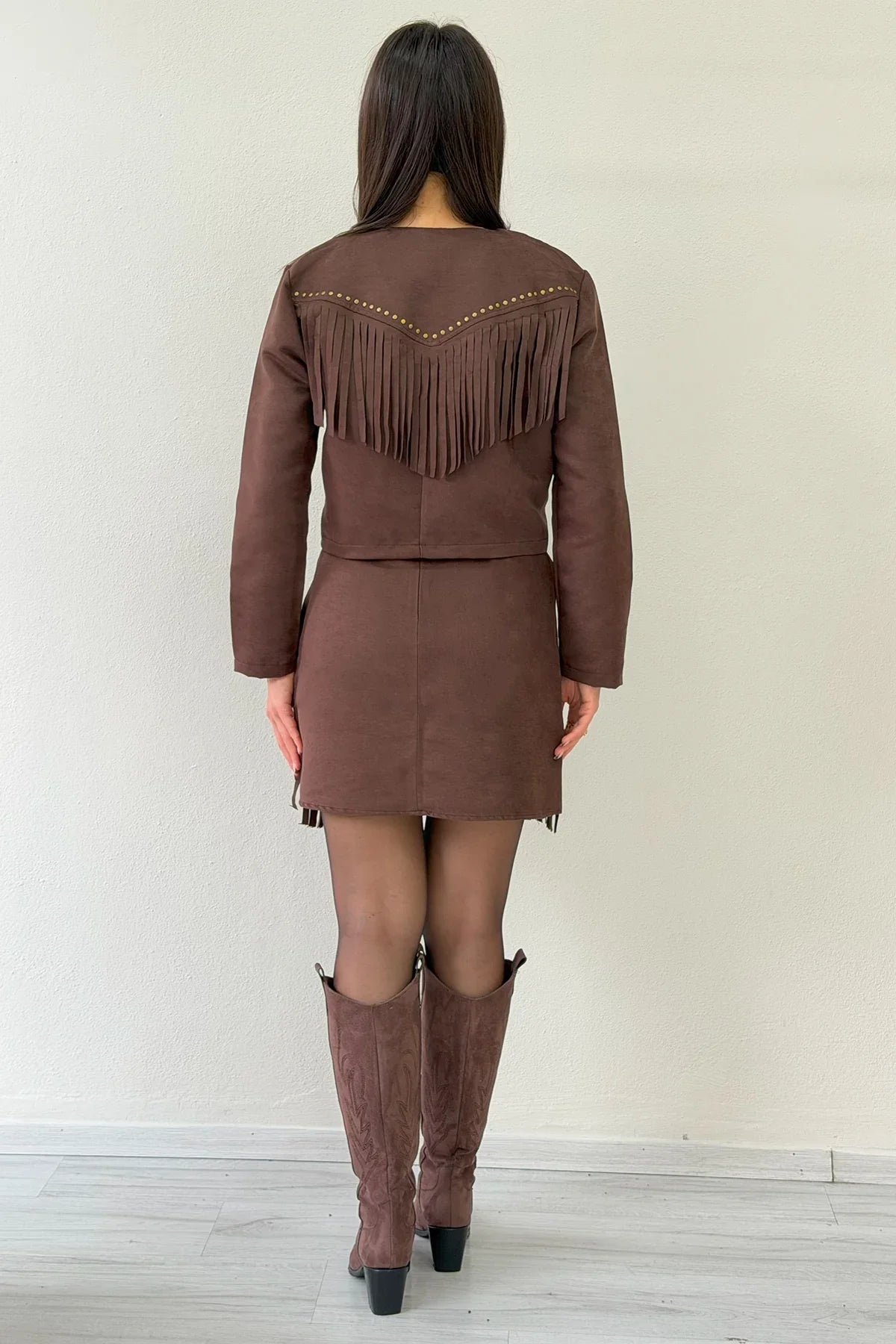 Braunes Set aus Jacke und Rock mit Fransen aus Wildleder