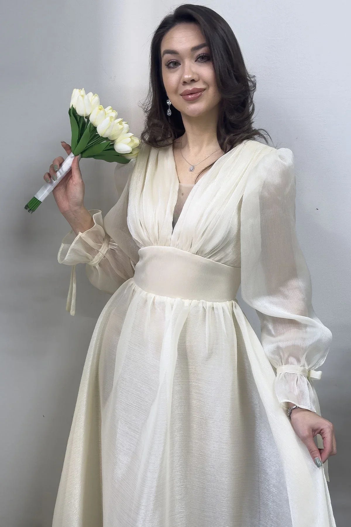 Cremefarbenes, asymmetrisches Maxi-Abendkleid im Prinzessinnenstil