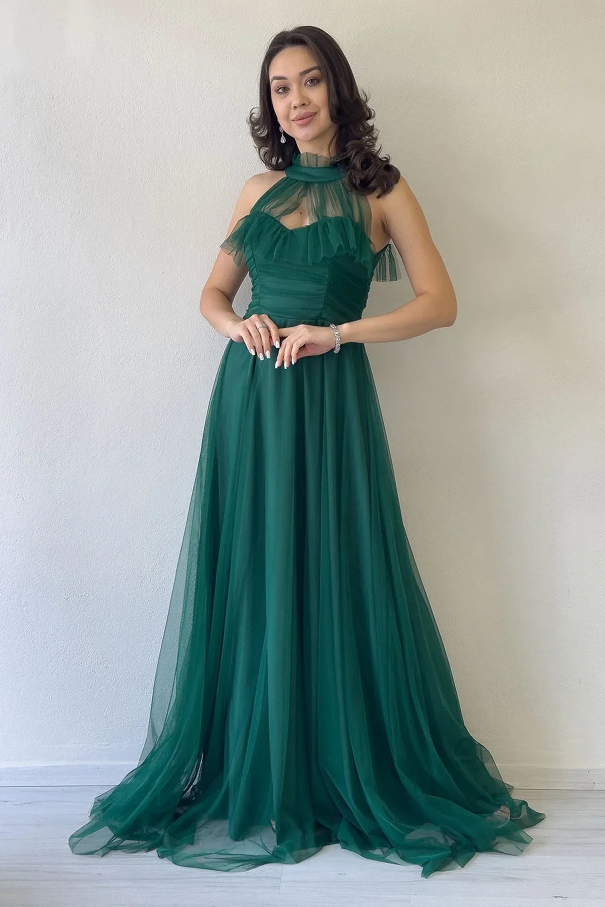 Smaragdgrünes ärmelloses Maxi-Abendkleid aus Tüll