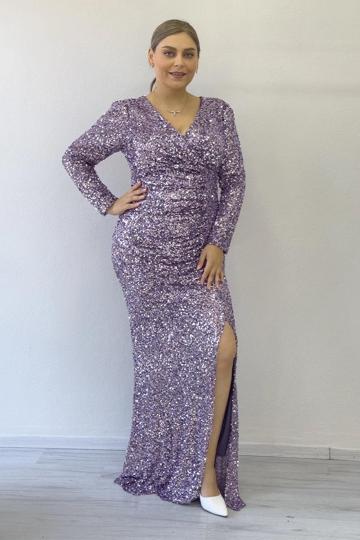 Das Paillettenkleid Lila mit langen Ärmeln und Schlitz in großen Größen ist mit seinem funkelnden und eleganten Design ein Kleidungsstück, das Ihre Eleganz bei besonderen Anlässen perfekt unterstreicht. Der von oben bis unten mit Pailletten besetzte Stoff erzeugt in jedem Licht ein anderes Funkeln. Während die langen Ärmel für eine raffinierte Note sorgen, verleiht der feminine Schlitz dem Kleid einen modernen und attraktiven Look. Dank des Plus-Size-Schnitts genießen Sie Komfort und Eleganz zugleich. Dieses Abendkleid ist die perfekte Wahl für besondere Anlässe wie Hochzeiten, Verlobungen, Abschlussfeiern, Partys und Galas. Die elegante Fliederfarbe lässt Sie strahlen. Die hochwertige Verarbeitung und der bequeme Schnitt zaubern eine stilvolle Silhouette, ohne einzuengen. Kombiniert mit High Heels und eleganten Accessoires garantiert es einen makellosen Look. Das lilafarbene Paillettenkleid mit langen Ärmeln und Schlitz in großen Größen vereint Eleganz und Komfort und verzaubert Ihre Gäste bei besonderen Anlässen mit seinem funkelnden Design. Der elegante Fliederton, die langen Ärmel und der feminine Schlitz verleihen ihm einen modernen Touch. Dank der großen Größenoptionen ist es ideal für einen komfortablen und gleichzeitig stilvollen Auftritt.