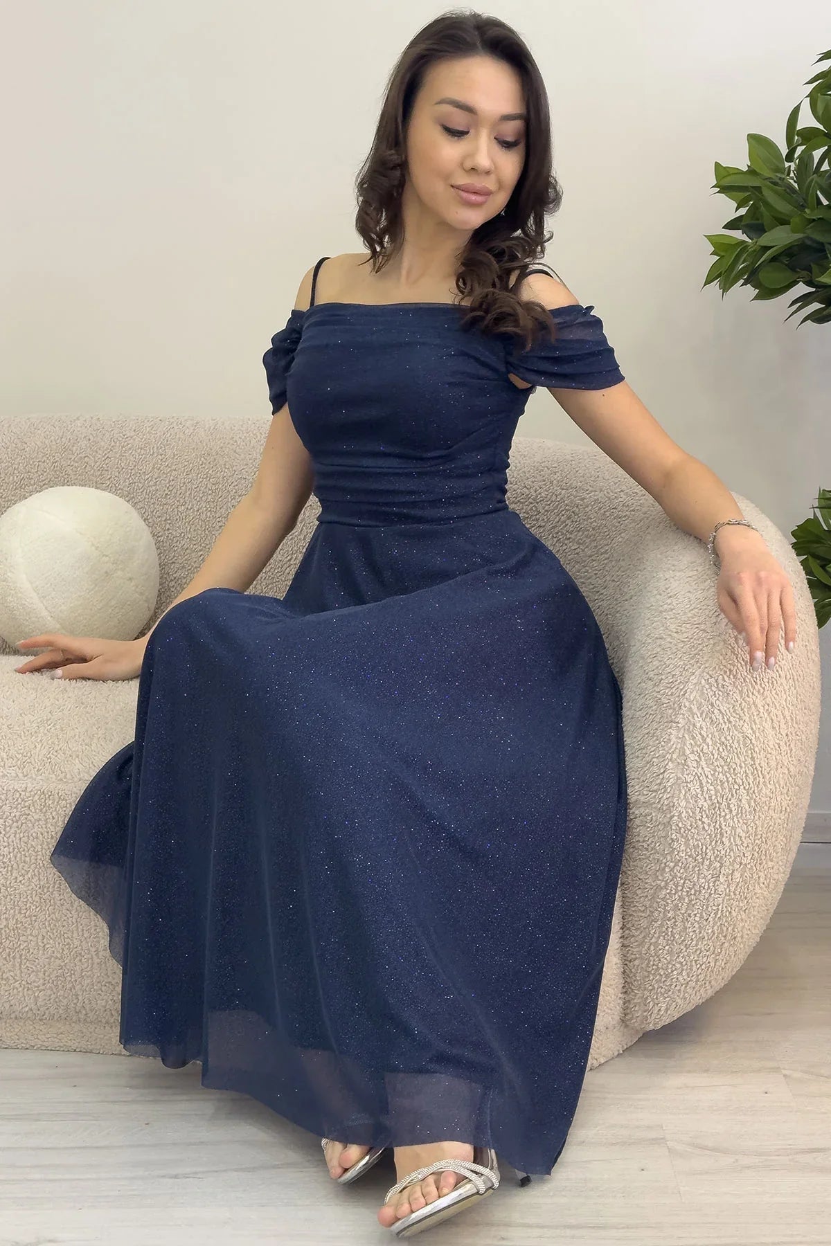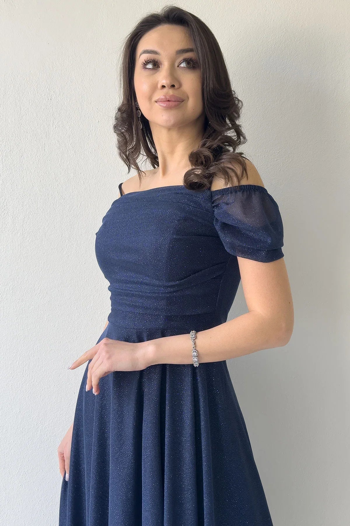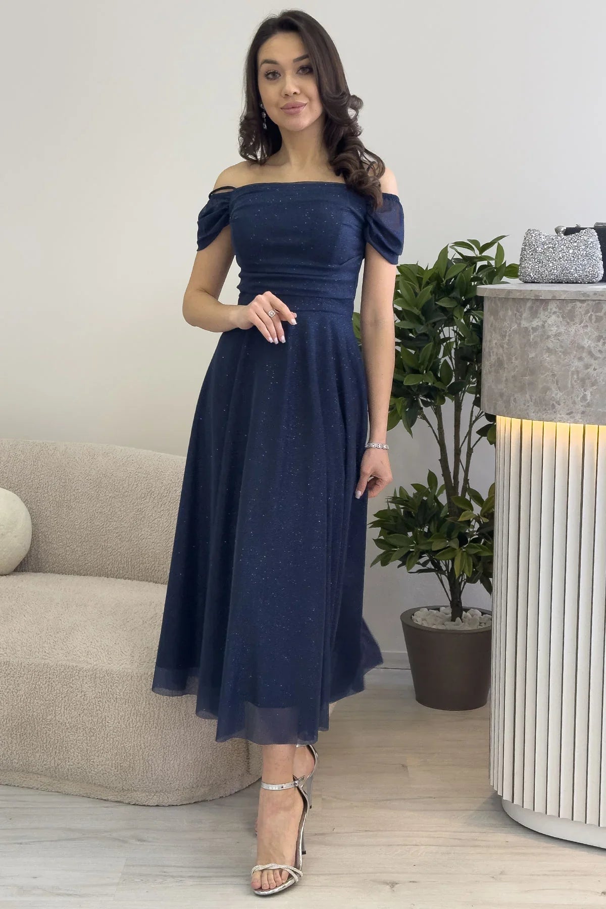 Marineblaues, mittellanges Abendkleid mit tiefem Schulterausschnitt