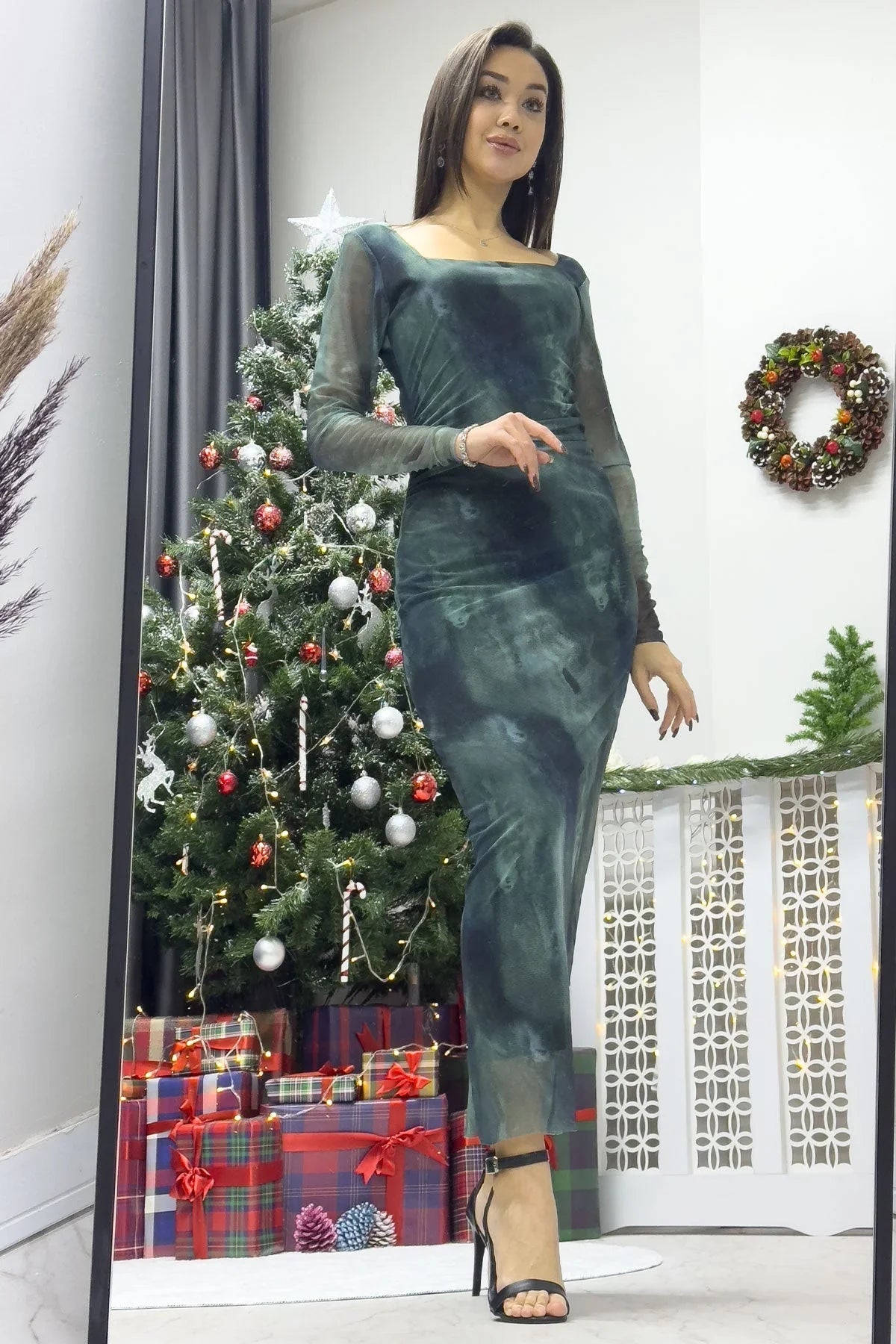 Türkisfarbenes, gemustertes Midi-Tüllkleid mit eckigem Ausschnitt