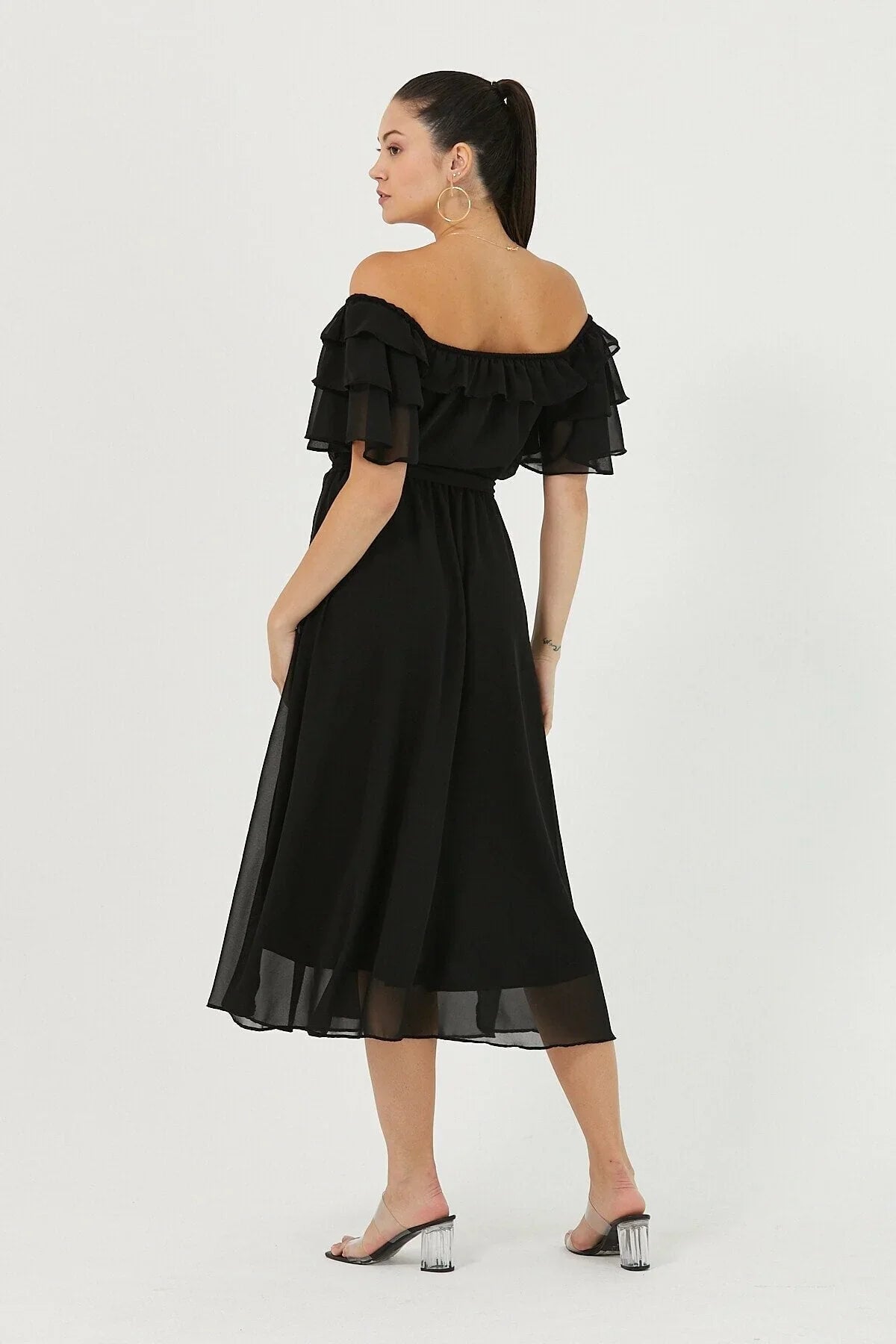 Black Ruffled Madonna Collar Plus Size Chiffon Dress