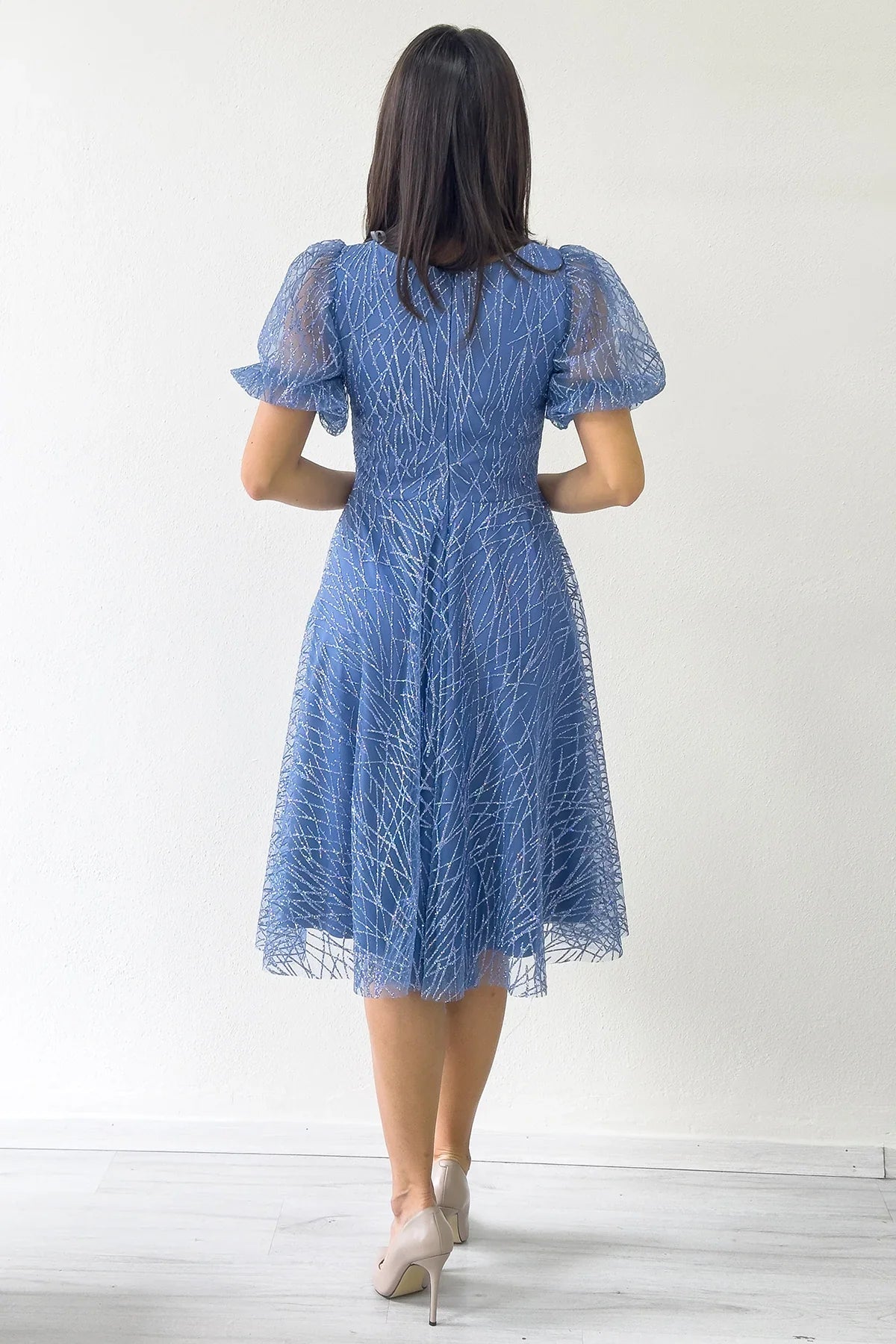 Indigo Midi Short Sleeve Glitter Evening Dress