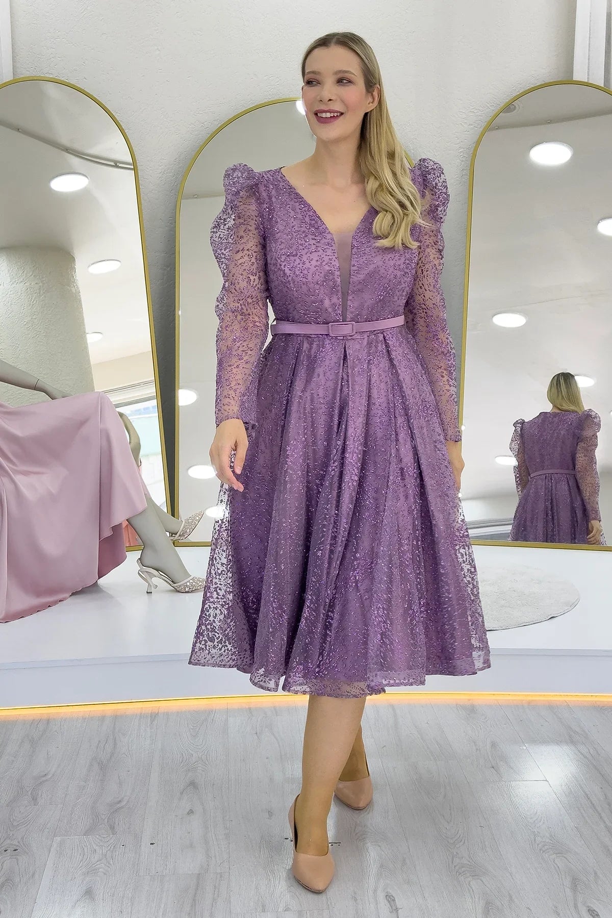 Lilac Midi Glittery Evening Dress