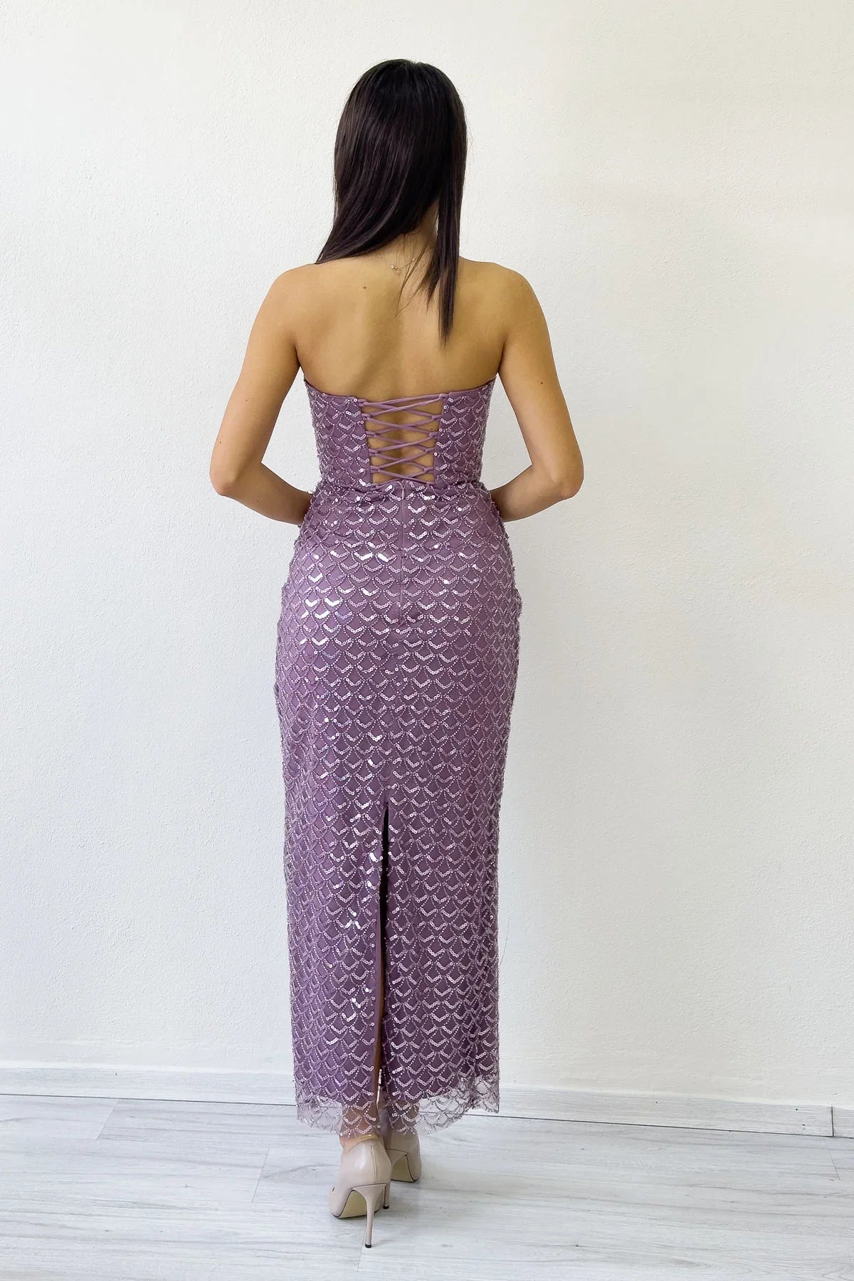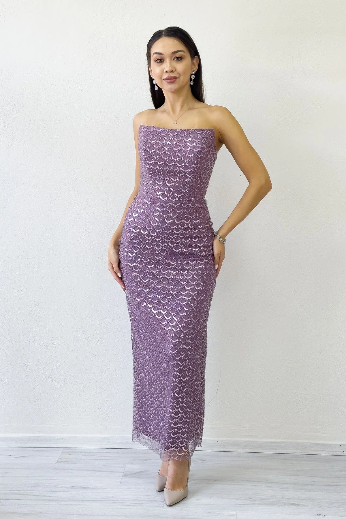 The Lila Strapless Beaded Midi Evening Dress, which combines elegance and style, is designed to draw all eyes to you on your special days. The strapless neckline detail provides a modern look, while the finely crafted beadwork adds a sparkling touch to the dress. The midi length allows for comfortable movement while creating a stylish silhouette for any event. With its figure-hugging fit that accentuates feminine curves, this dress is a timeless piece perfect for weddings, engagements, cocktail parties, and special occasions. Its high-quality fabric ensures comfortable wear, while the elegance of the lilac tone lends a youthful and sophisticated style. With a wide range of sizes from XS to plus sizes, it adapts to everyone's style.