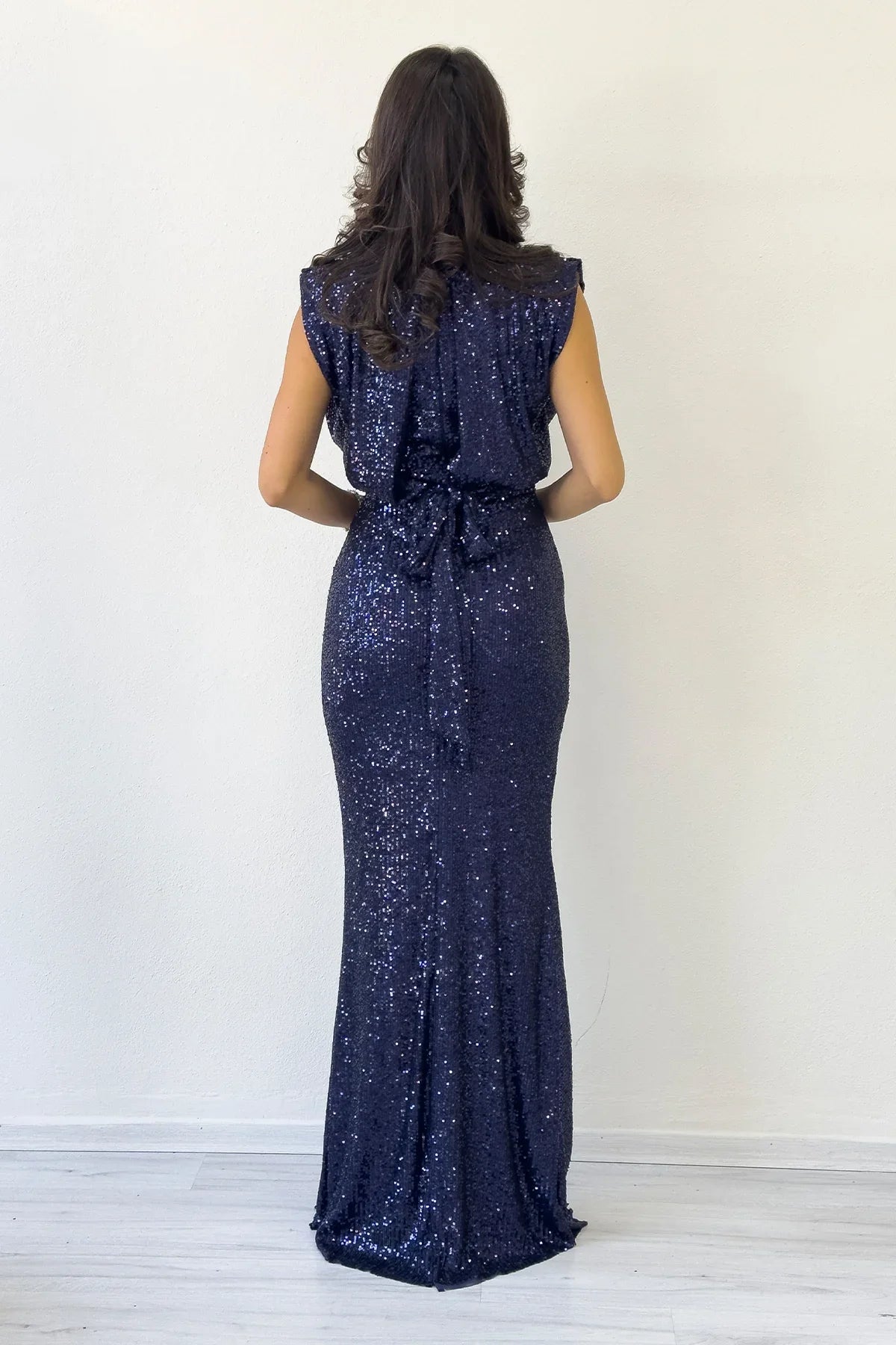 Women's Navy Blue High-Necked Belted Slit Sequin Evening Dress This chic and elegant evening dress is designed to give you a dazzling look at your special events. The regal touch of navy blue combines with sequin details to create a sparkling effect. The stand-up collar design gives a modern look, while the belt detail elegantly accentuates your waist and creates a feminine silhouette. The slit detail on the dress allows freedom of movement while adding a sophisticated touch. Its comfortable cut and high-quality fabric ensure comfort for hours on end. It is an ideal choice for special occasions such as engagements, weddings or graduations, allowing you to reflect your style at its best. Colour: Navy blue Details: Stand-up collar, belted, slit, sequin embellishment Fabric: High-quality and comfortable material Sizes: Standard and plus sizes available If you are preparing for a special occasion, this dress will help you highlight your elegance and style.
