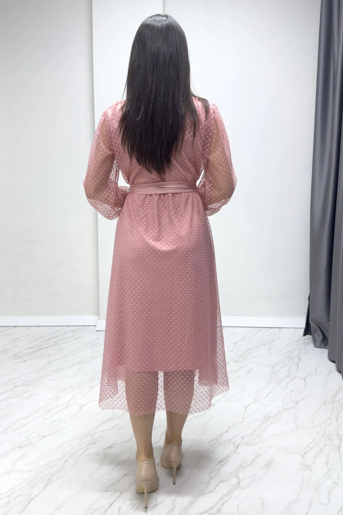 Pink Polka Dot Belted V-Neck Flared Dress
