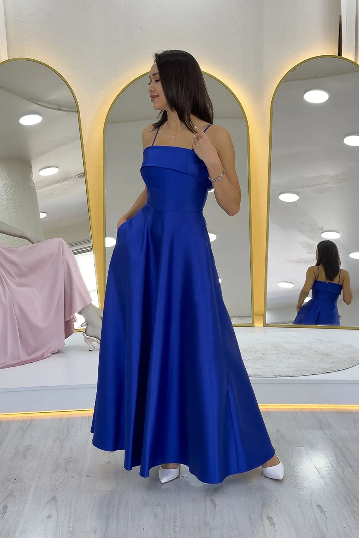 The Saks Blue Strapless Dress with Pocket Detail combines elegance with modern details, featuring a striking design that will highlight your style. Its thin straps offer a feminine look, while the stylish pocket detail on the sides adds a modern and comfortable feel to the dress. This model, with its satin-like shiny fabric that reflects light beautifully, perfectly complements your style at engagements, weddings, graduations and special events. The dress, with its regal shade of sapphire blue, creates an elegant silhouette with its figure-hugging form. 🟦 Key Features Colour: Navy Blue Model: Thin Straps, Pocket Detail Fabric: Flowing and draped structure Occasion: Wedding, engagement, graduation, special events