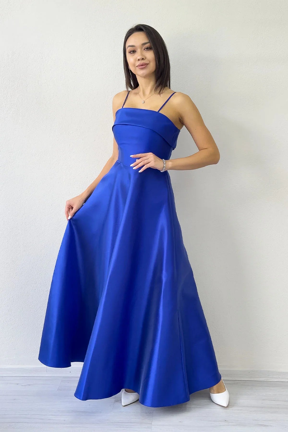 Saxe Blue Satin Midi Thin Strap Evening Dress