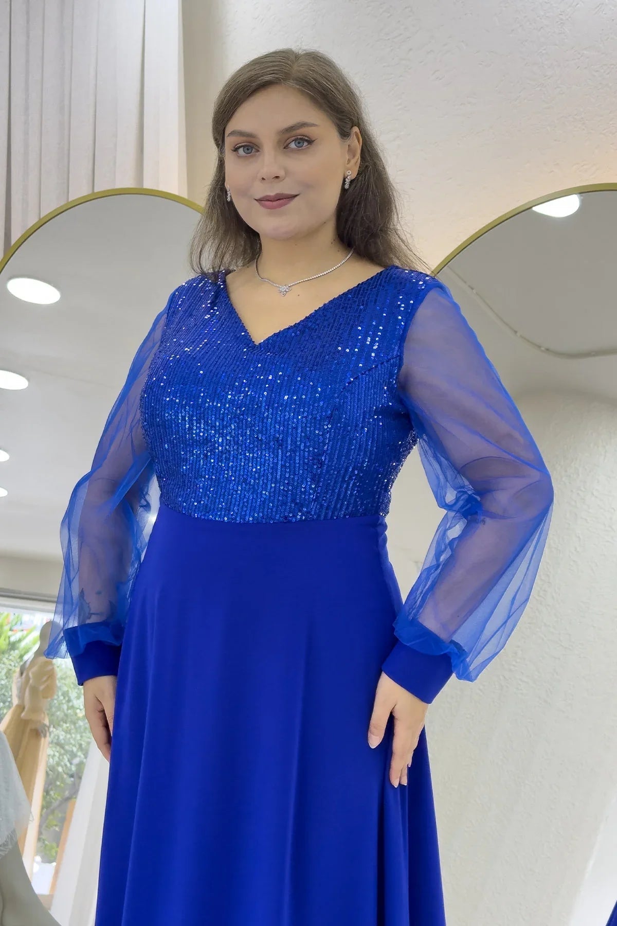 Discover the most elegant form of sparkle... The Transparent Blue Sequin Large Size Evening Dress, with its captivating colour and eye-catching details, is one of the most striking pieces for special occasions. The eye-catching sapphire blue tone draws all attention to you with its elegance, while the sequin embellishments that reflect light from every angle ensure you are the star of the night. The special cut that gently hugs the body offers a comfortable and elegant look for plus size women. The long sleeves, designed in transparent tulle fabric, give the dress a modern touch. This detail combines both elegance and comfort. The dress's shiny texture sparkles with every movement; however, its soft lining ensures it does not cause any discomfort on the skin. The slight drape transitions at the waist and the sparkling sequin texture create a more balanced silhouette. The long skirt cut creates a flowing elegance when walking. The hidden zip detail at the back gives the dress a simple finish. Sapphire blue, a powerful yet elegant colour, is a must-have for women who want to emphasise their elegance at weddings, engagements, graduations and evening events. This model reflects the style of confident women on special occasions and at night-time events. The ZKS design philosophy is based on providing the same elegance for every body type. This evening gown is specially designed for women in sizes 42–50. Its flexible structure hugs the body without constricting it, and its breathable fabric provides comfort for long hours. As a combination suggestion, you can complete your look with a silver-toned bag and high-heeled shoes. You can balance excessive brightness with a minimal jewellery selection and bring your evening gown to the forefront. Fabric Information: Sequined fabric, lycra inner lining. Pattern: Full body fit, special cut for larger sizes. Closure: Concealed zip. Colour: Sax Blue. Size Range: 42–50. Occasion: Wedding, engagement, graduation, invitation, special evenings Confidence in every size, elegance in every stitch. Designed for the ZKS woman.
