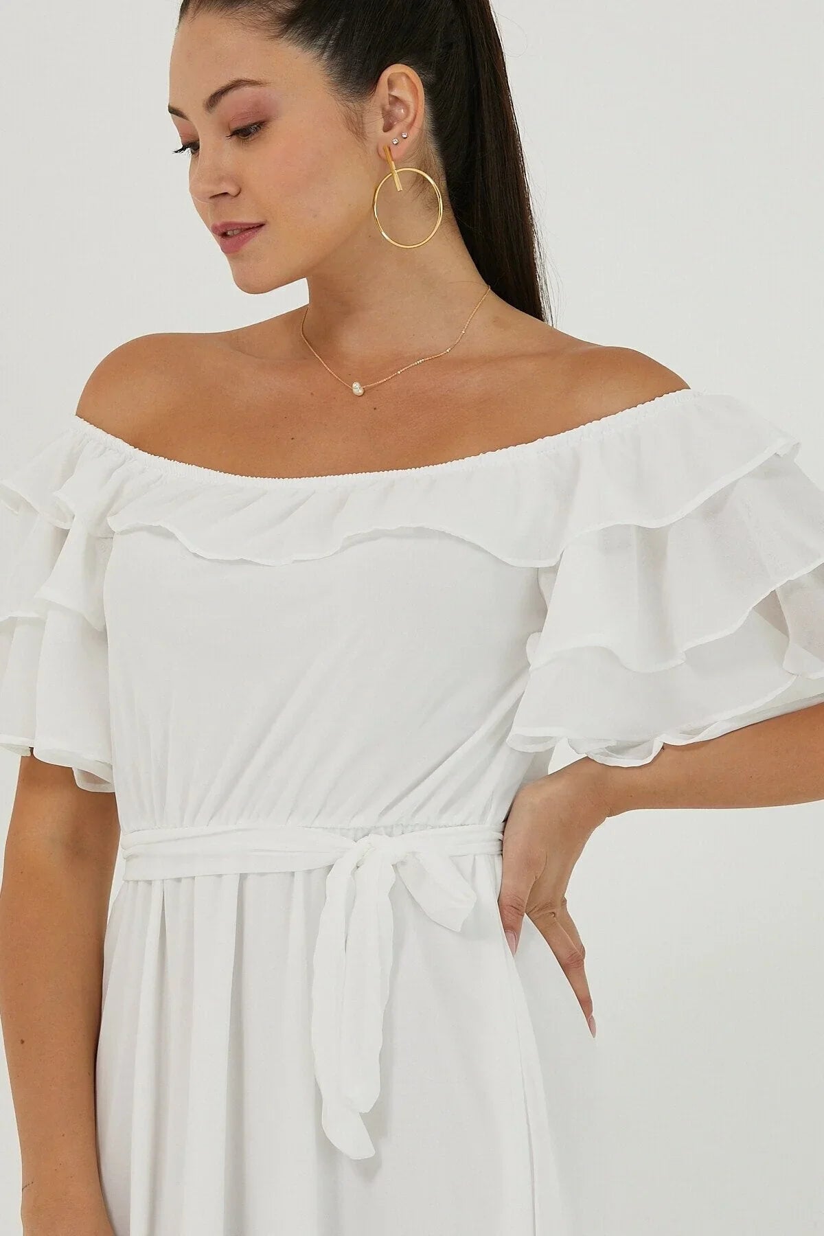 White Ruffled Madonna Collar Plus Size Chiffon Dress